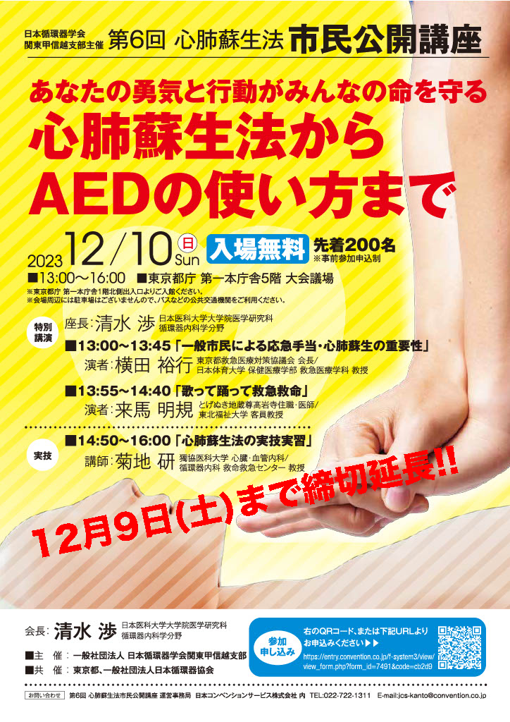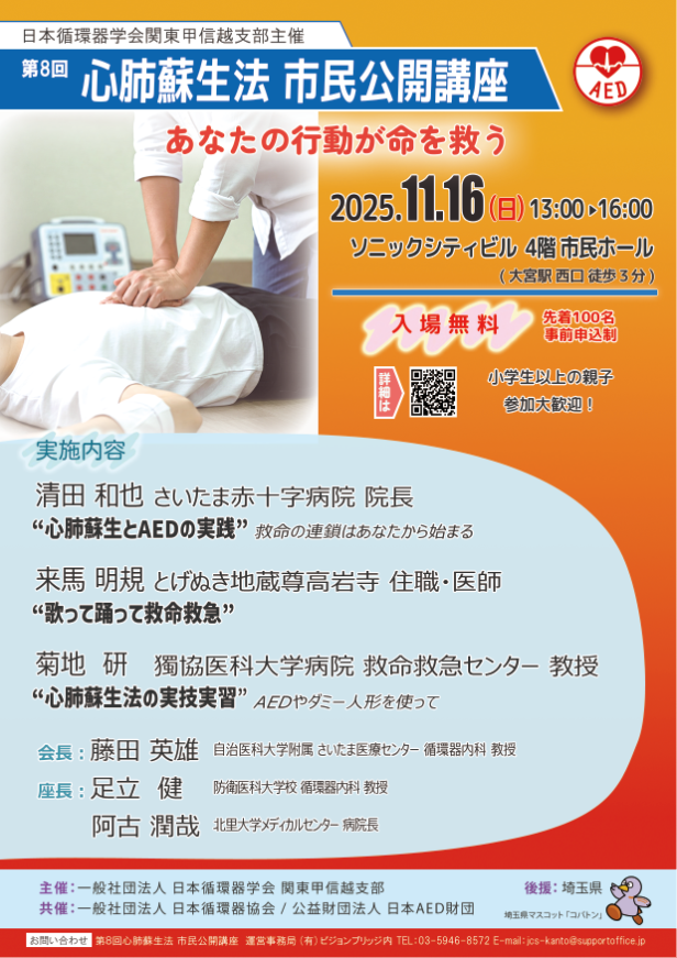髙岩寺住職出演入場無料救急救命法講習会初心者向け JR大宮駅前で開催先着100人限定 事前申込制日本循環器学会関東甲信越支部主催第8回心肺蘇生法市民公開講座令和6年 11月 16日(日) 13時~16時詳細はこちらから>>ソニックシティ・アクセス>>申込フォーム(外部サイト)>>第8回心肺蘇生法 市民公開講座 運営事務局(有)ビジョンブリッジ 内☎ 03-5946-8572