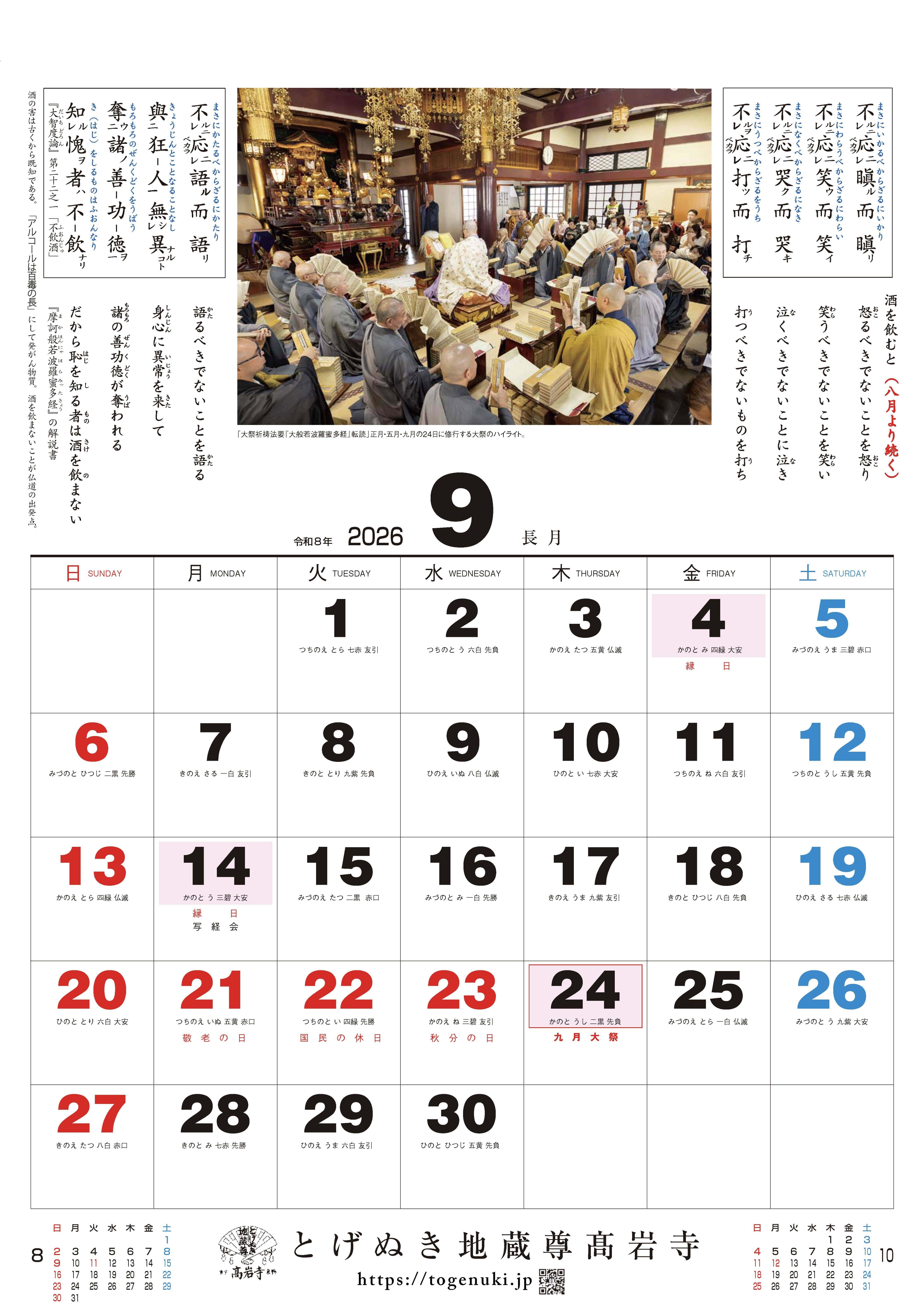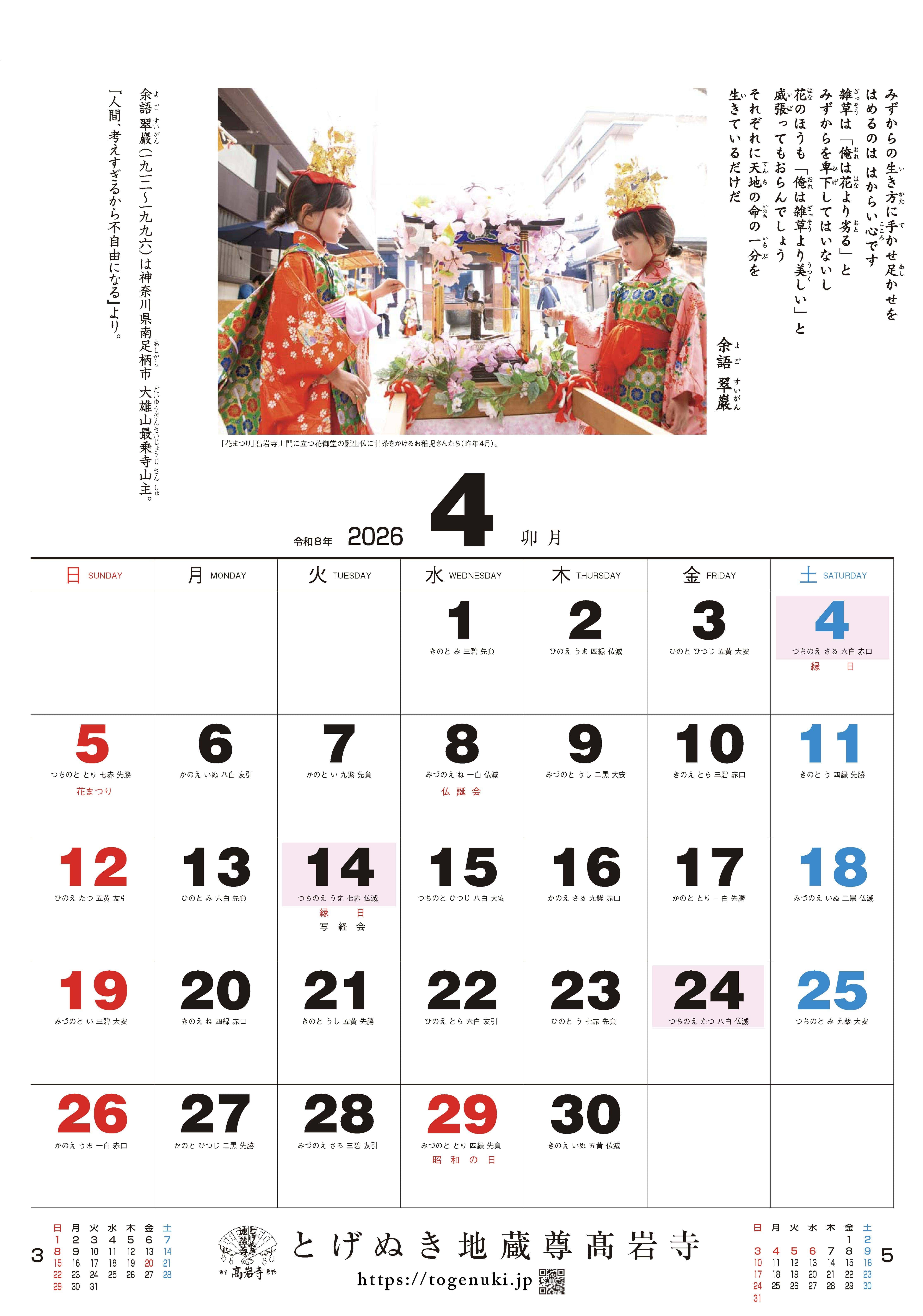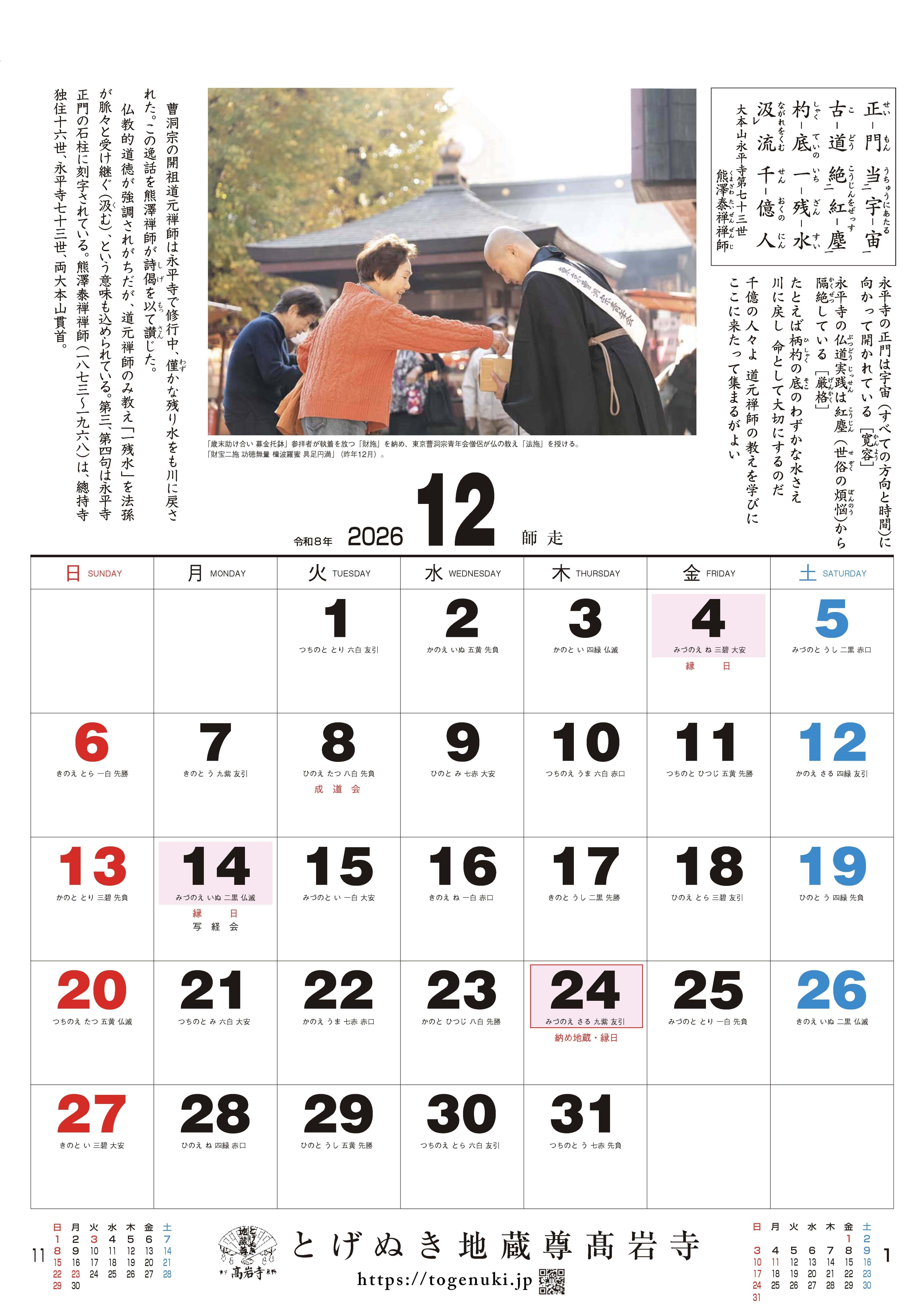 「とげぬき地蔵尊カレンダー」は髙岩寺先代住職・大法規雄大和尚が平成11年より始めました。長年地元で活躍してきた大谷明カメラマンの季節感あふれる写真、仏教のみならず世界の様々な名言、そして毎月4,14,24日の「縁日」をぬり分けた暦を組み合わせています。毎年12月4日縁日の朝のおつとめ終了後より、本堂受付にて、御祈祷を申し込まれた方などに頒布しています。本ページに一部を掲載いたします。