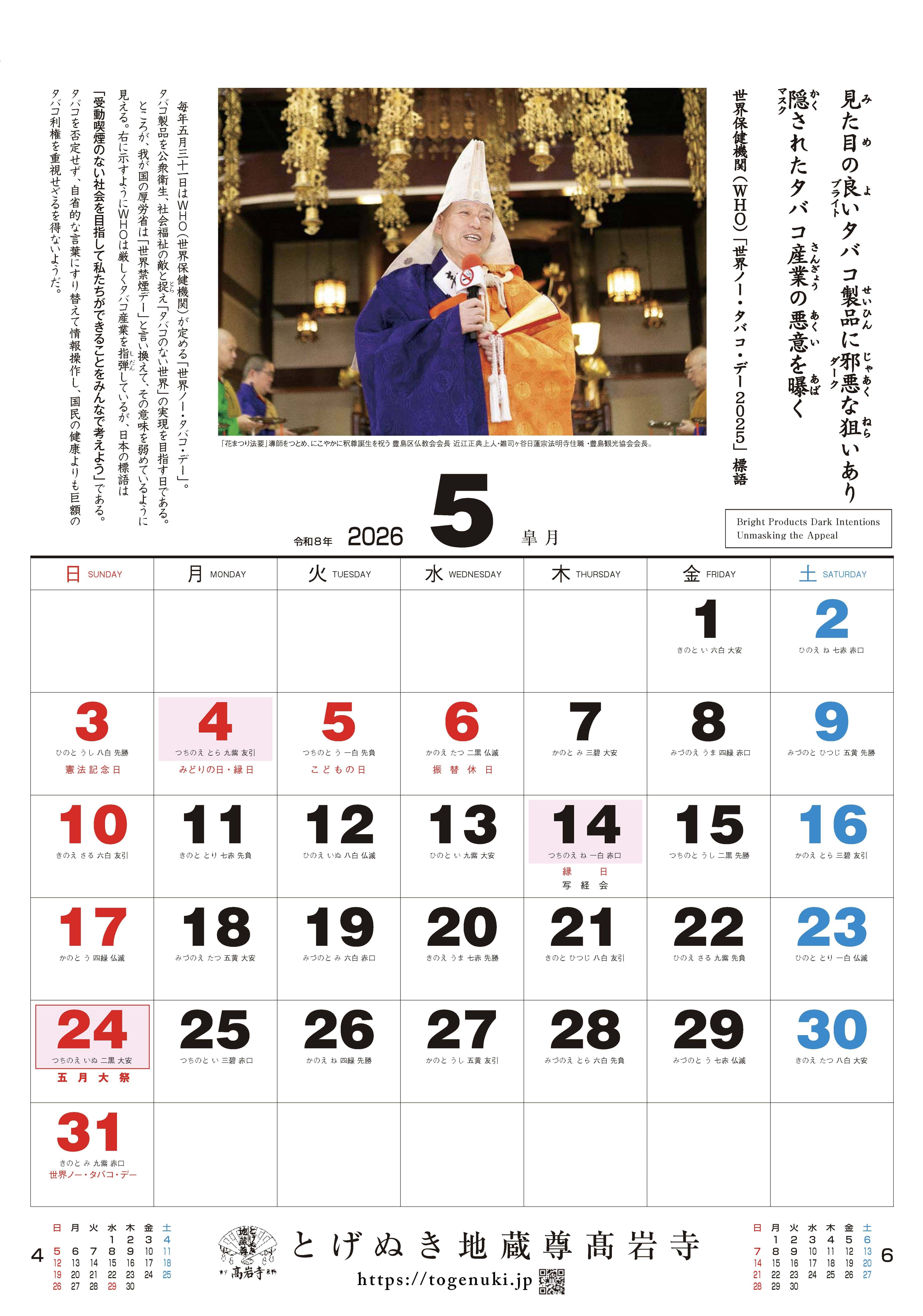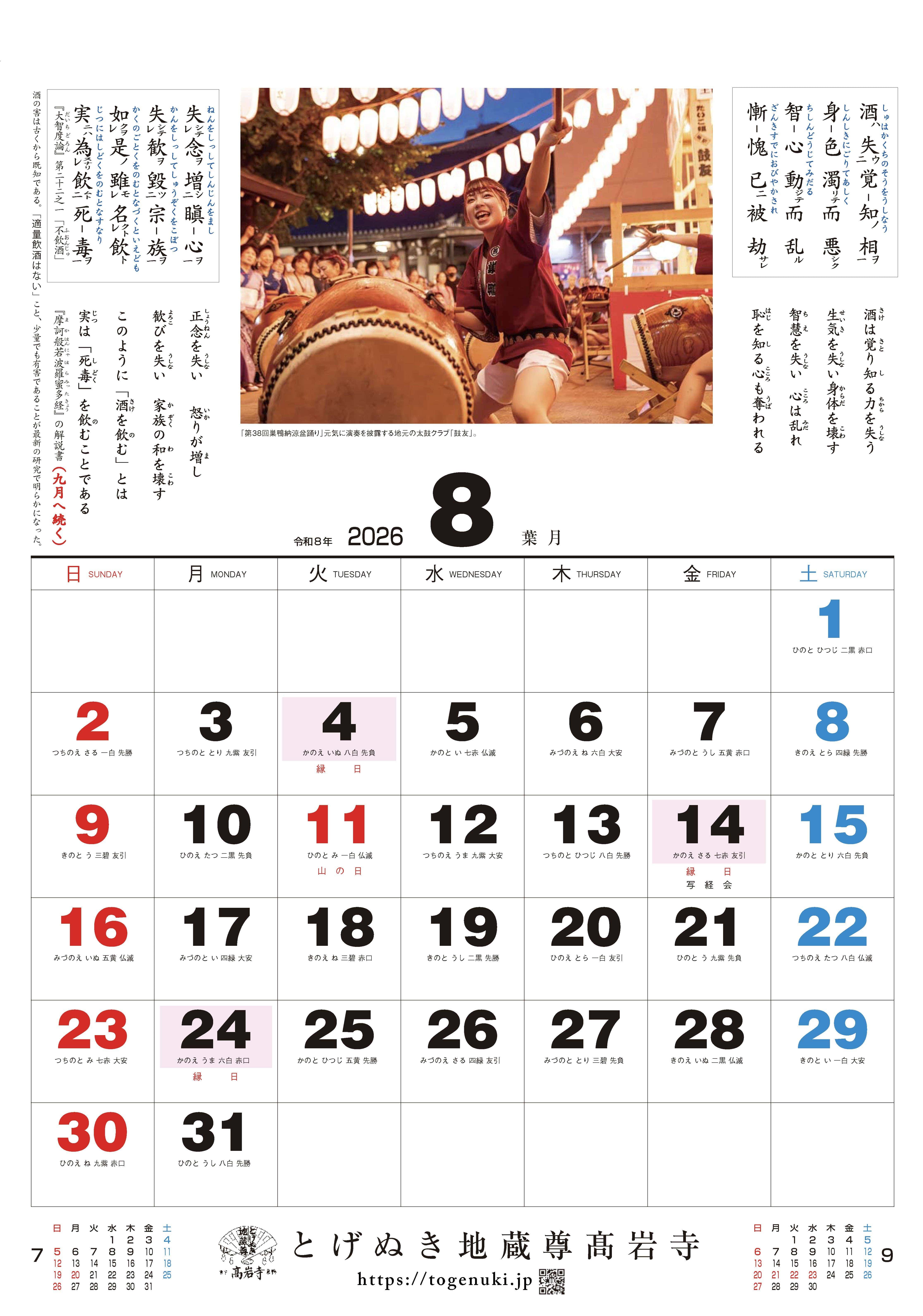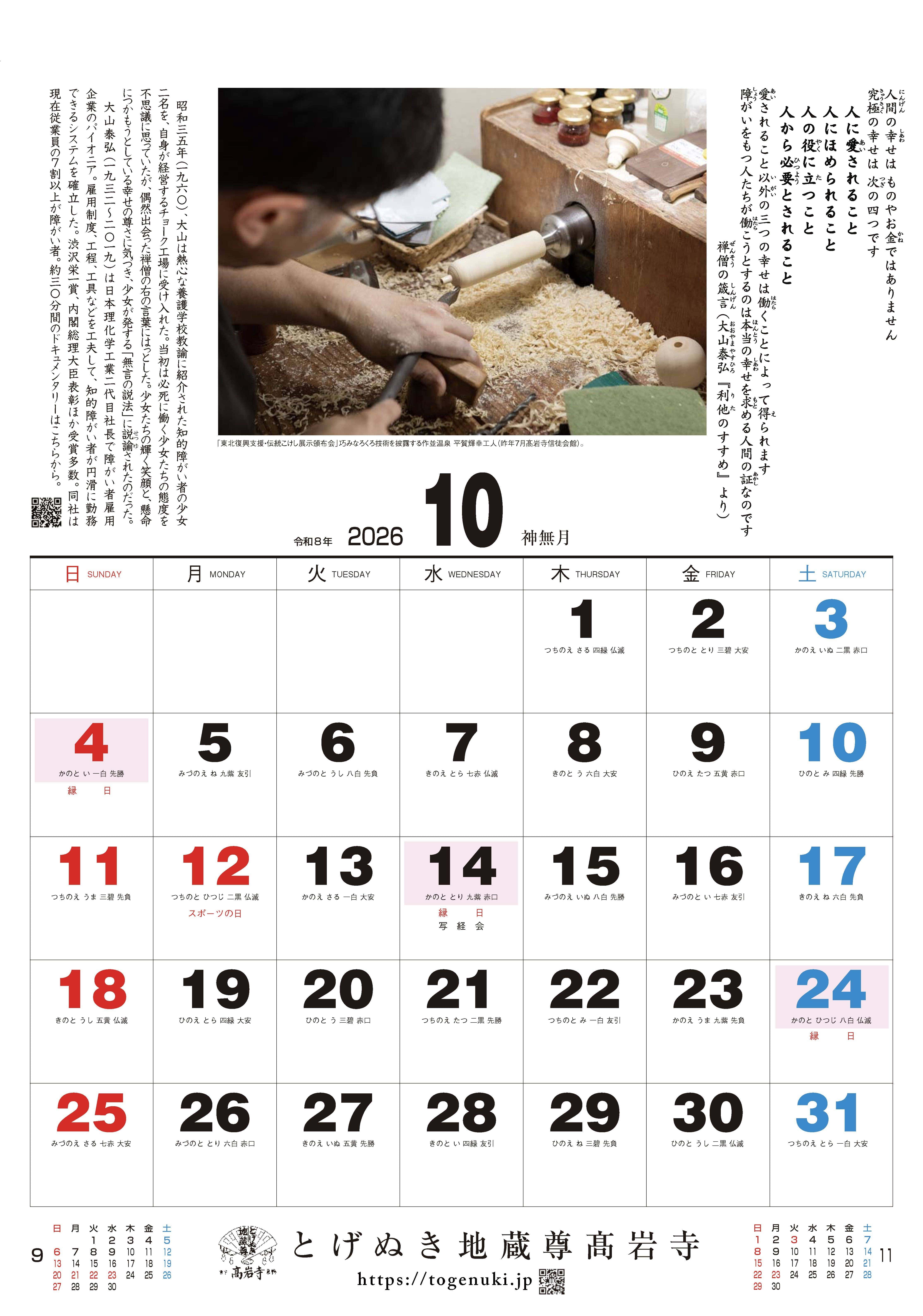 「とげぬき地蔵尊カレンダー」は髙岩寺先代住職・大法規雄大和尚が平成11年より始めました。長年地元で活躍してきた大谷明カメラマンの季節感あふれる写真、仏教のみならず世界の様々な名言、そして毎月4,14,24日の「縁日」をぬり分けた暦を組み合わせています。毎年12月4日縁日の朝のおつとめ終了後より、本堂受付にて、御祈祷を申し込まれた方などに頒布しています。本ページに一部を掲載いたします。