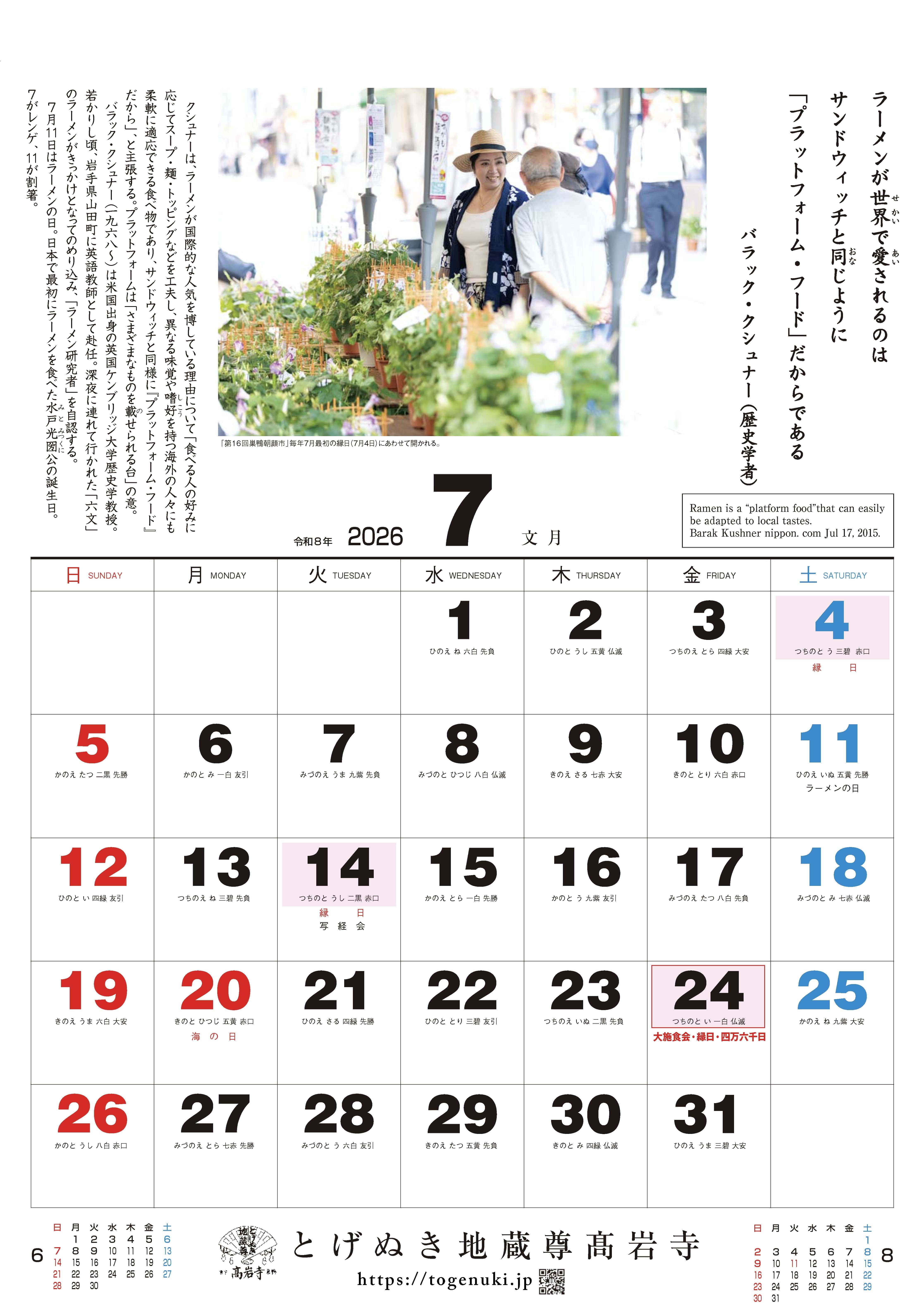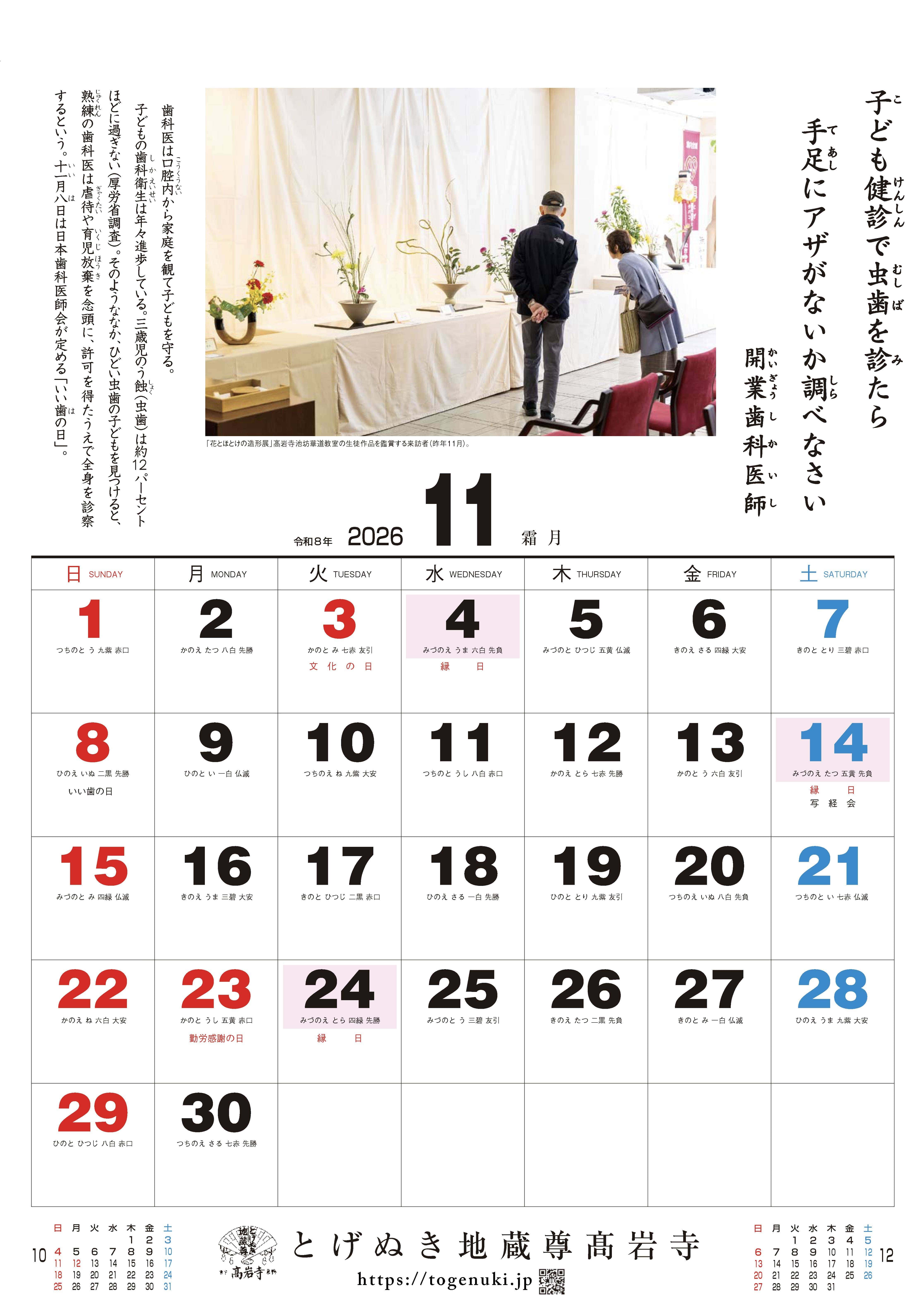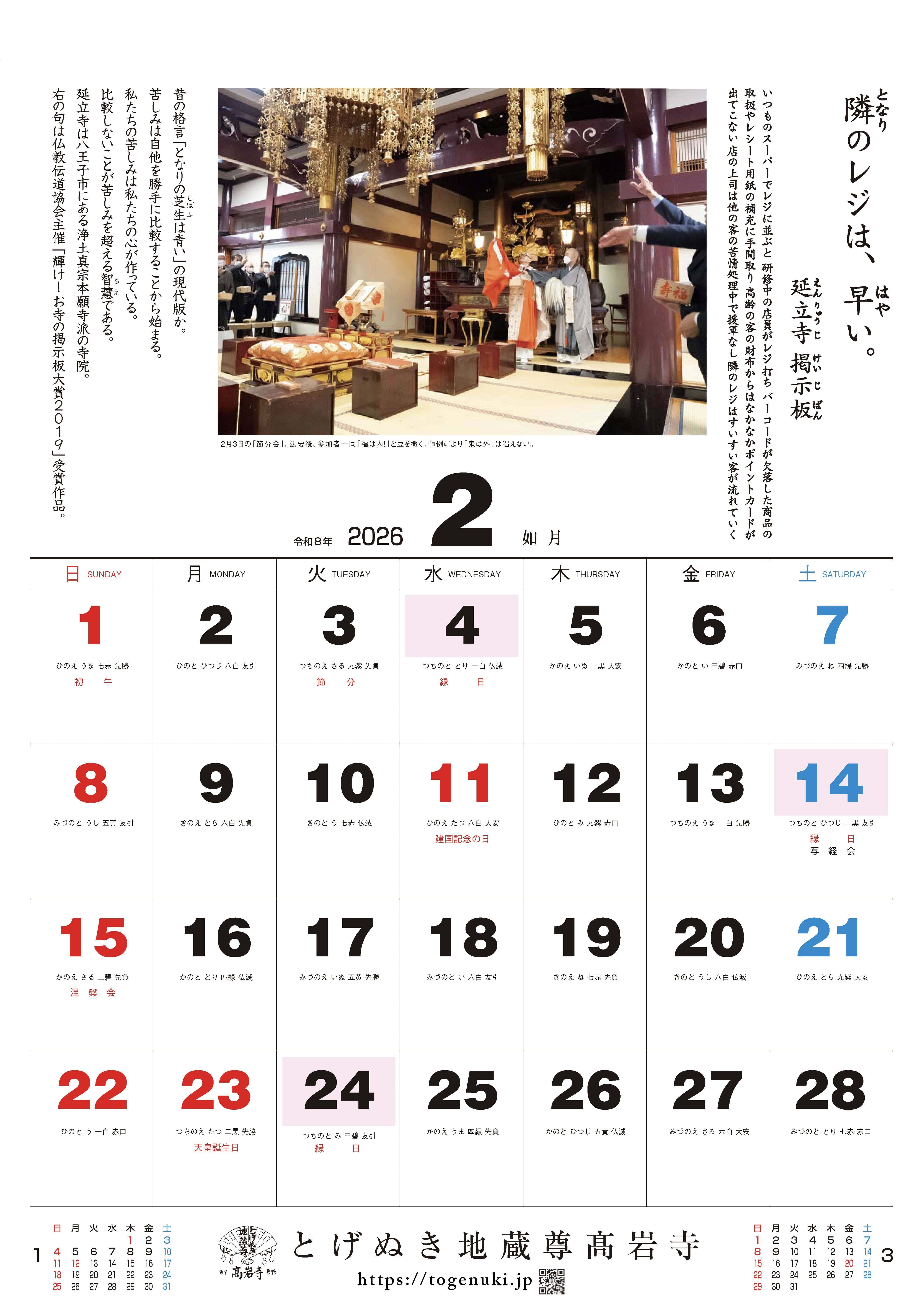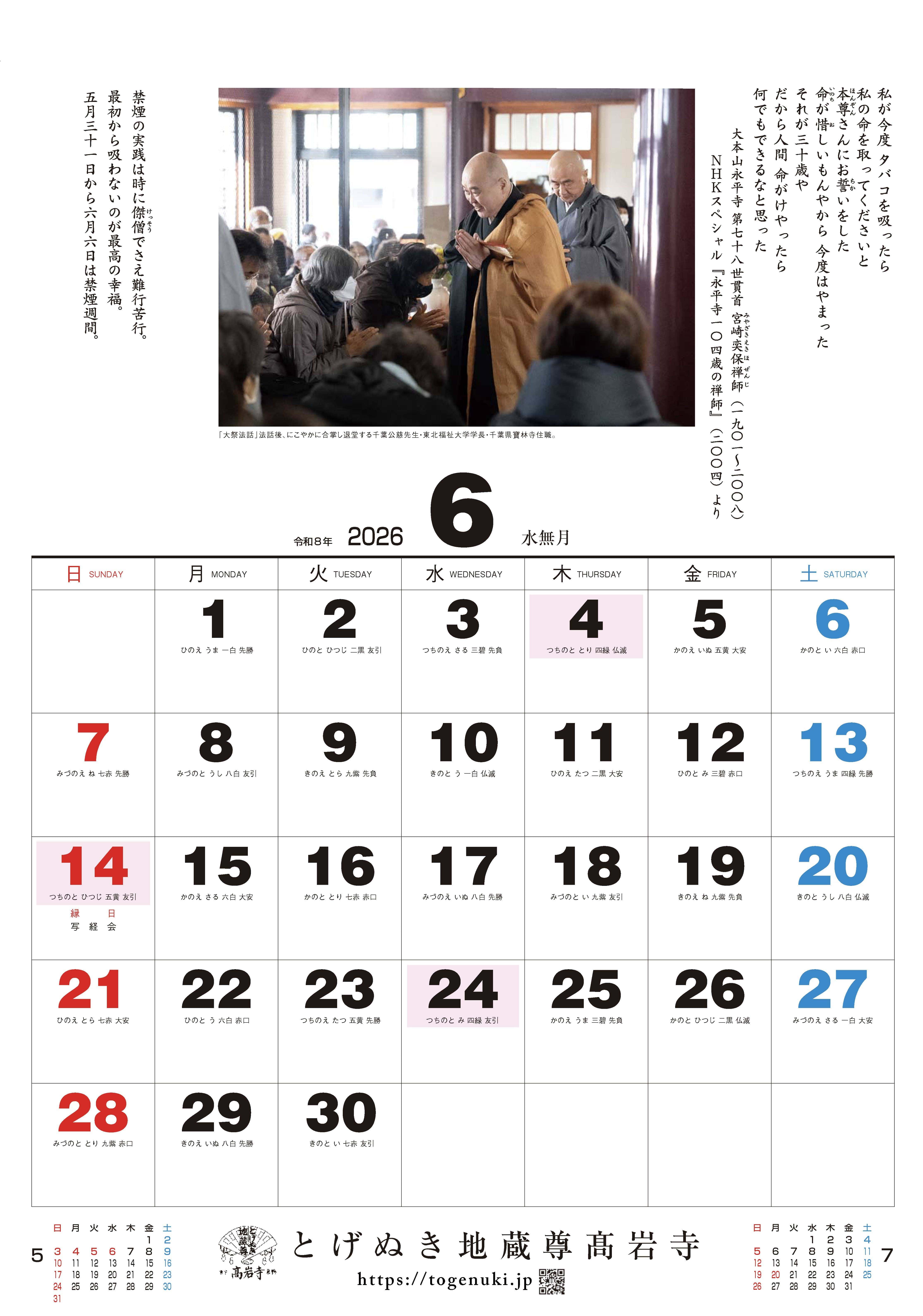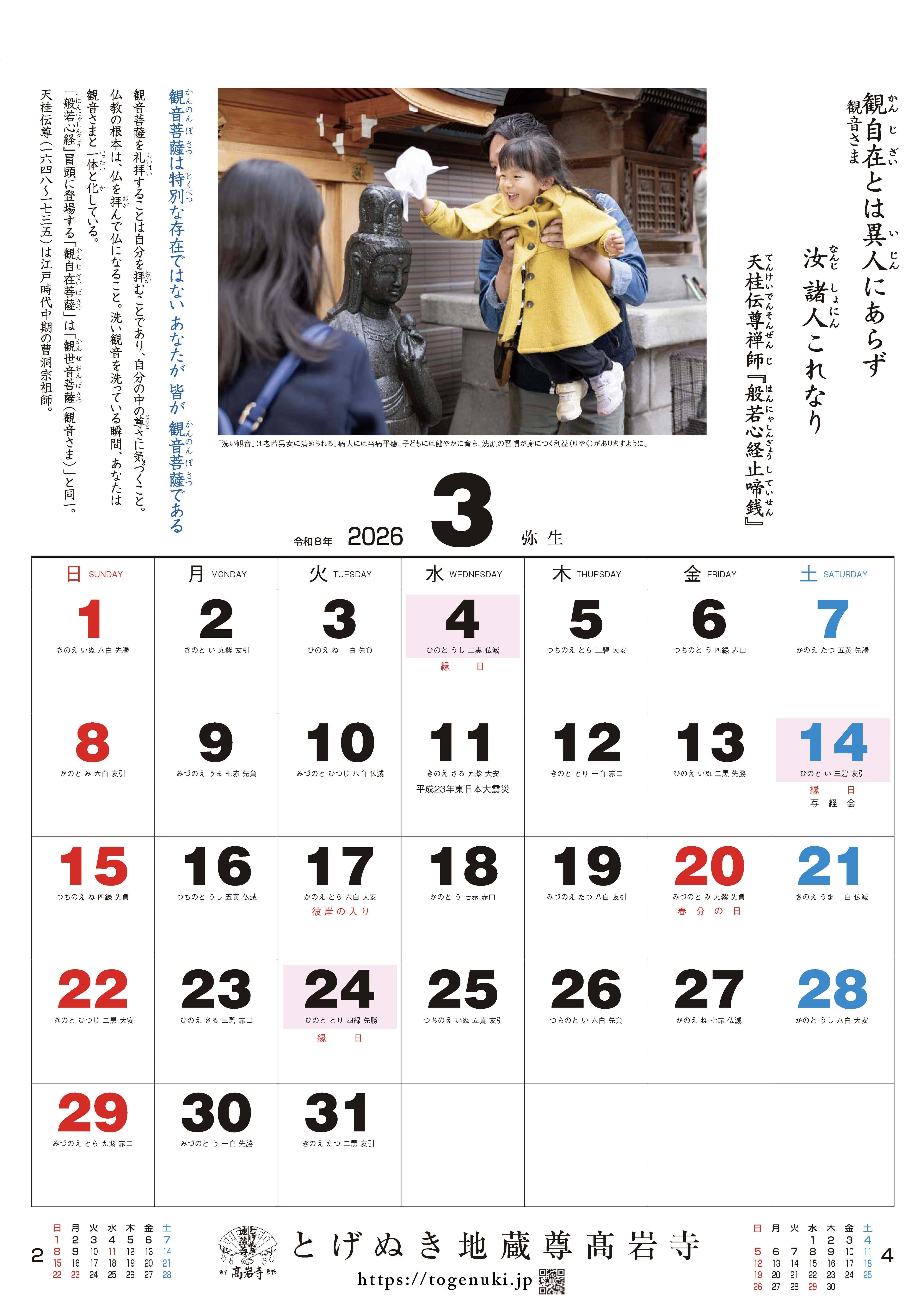 「とげぬき地蔵尊カレンダー」は髙岩寺先代住職・大法規雄大和尚が平成11年より始めました。長年地元で活躍してきた大谷明カメラマンの季節感あふれる写真、仏教のみならず世界の様々な名言、そして毎月4,14,24日の「縁日」をぬり分けた暦を組み合わせています。毎年12月4日縁日の朝のおつとめ終了後より、本堂受付にて、御祈祷を申し込まれた方などに頒布しています。本ページに一部を掲載いたします。