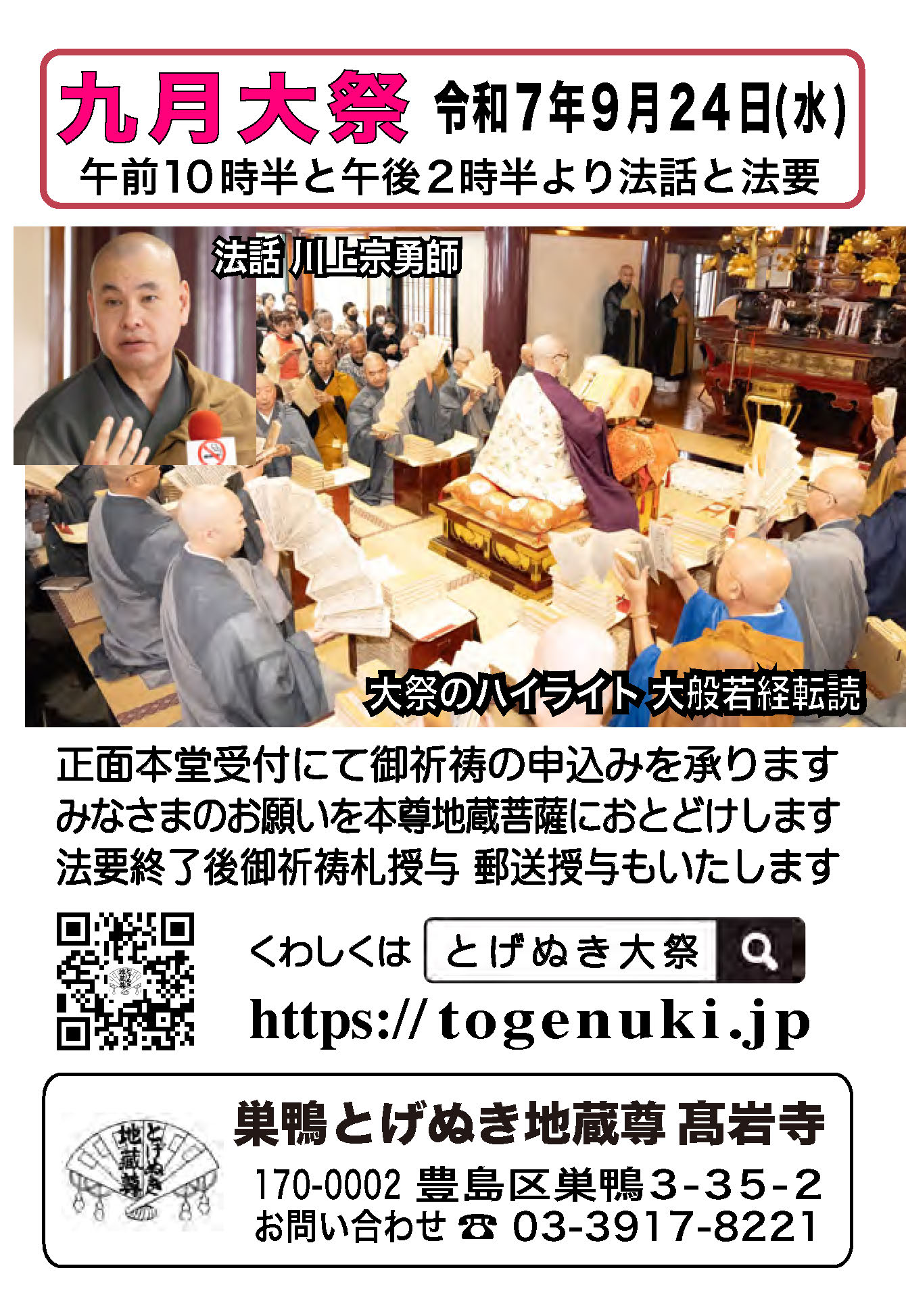 正月・5月・9月24日の特別な縁日で、午前午後の2回、大法要を正面の本堂で修行します。30名ほどの僧侶とともに地蔵尊に現世利益を願います。